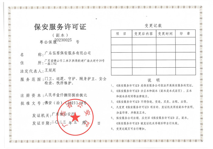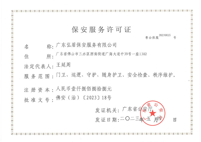 - 廣東弘盾保安服務有限公司東莞分公司是經東莞市公安局嚴格審核,廣東省公安廳批準頒發(fā)《保安服務許可證》,在東莞市工商行政管理機關登記注冊的,依法開展門衛(wèi)、巡邏守護、秩序維護、隨身護衛(wèi),安全檢查等綜合安保服務的專業(yè)保安服務公司... [詳細介紹]